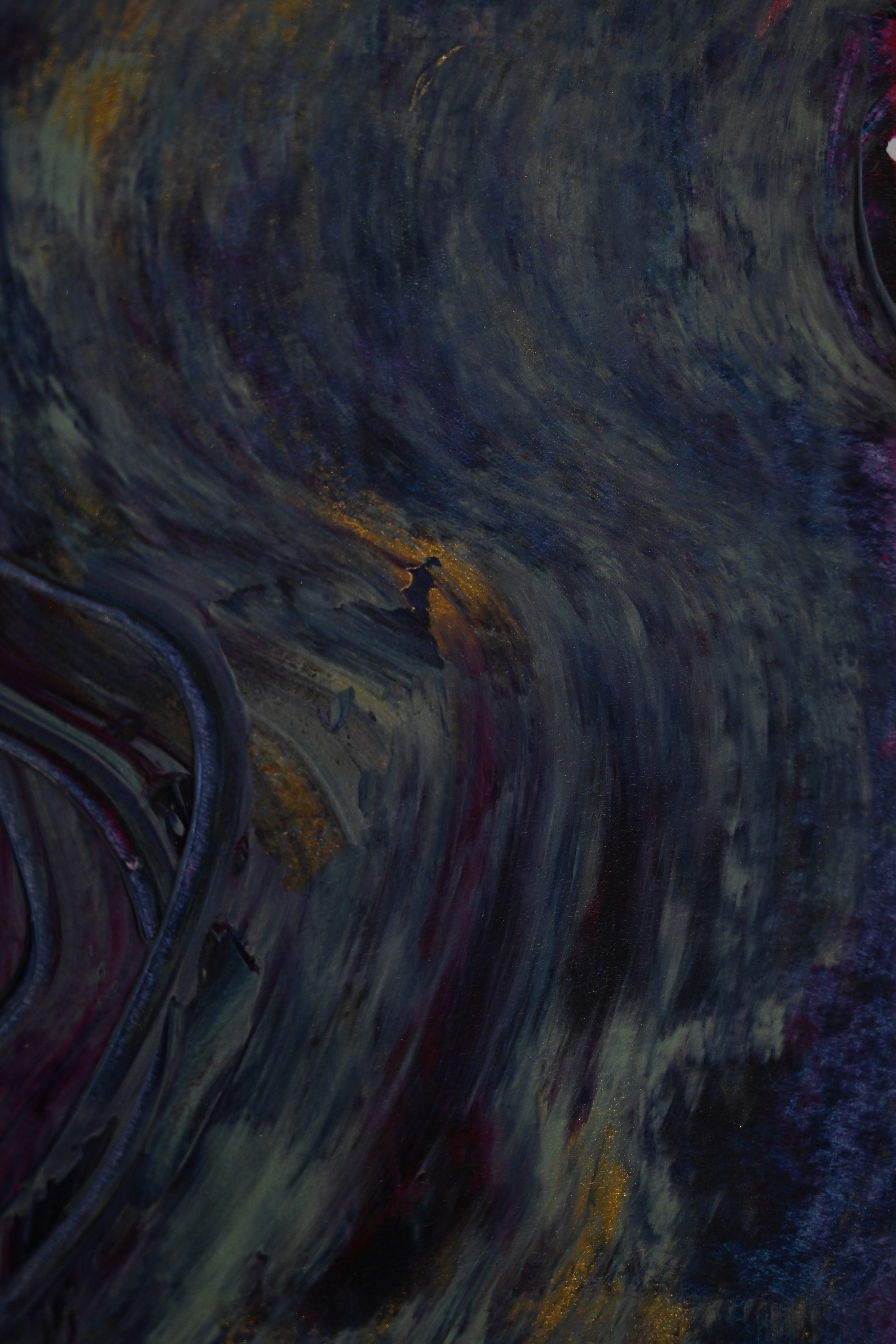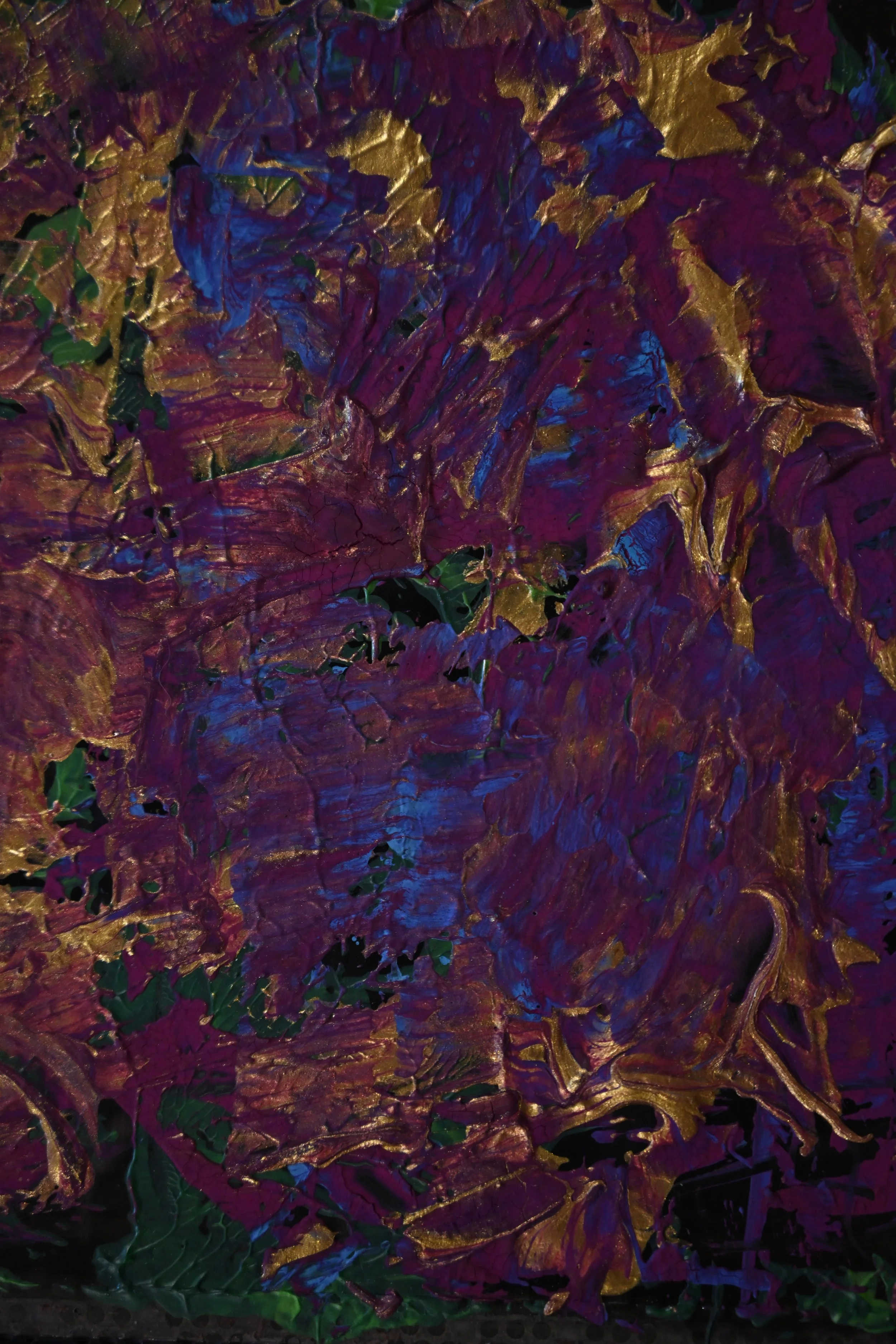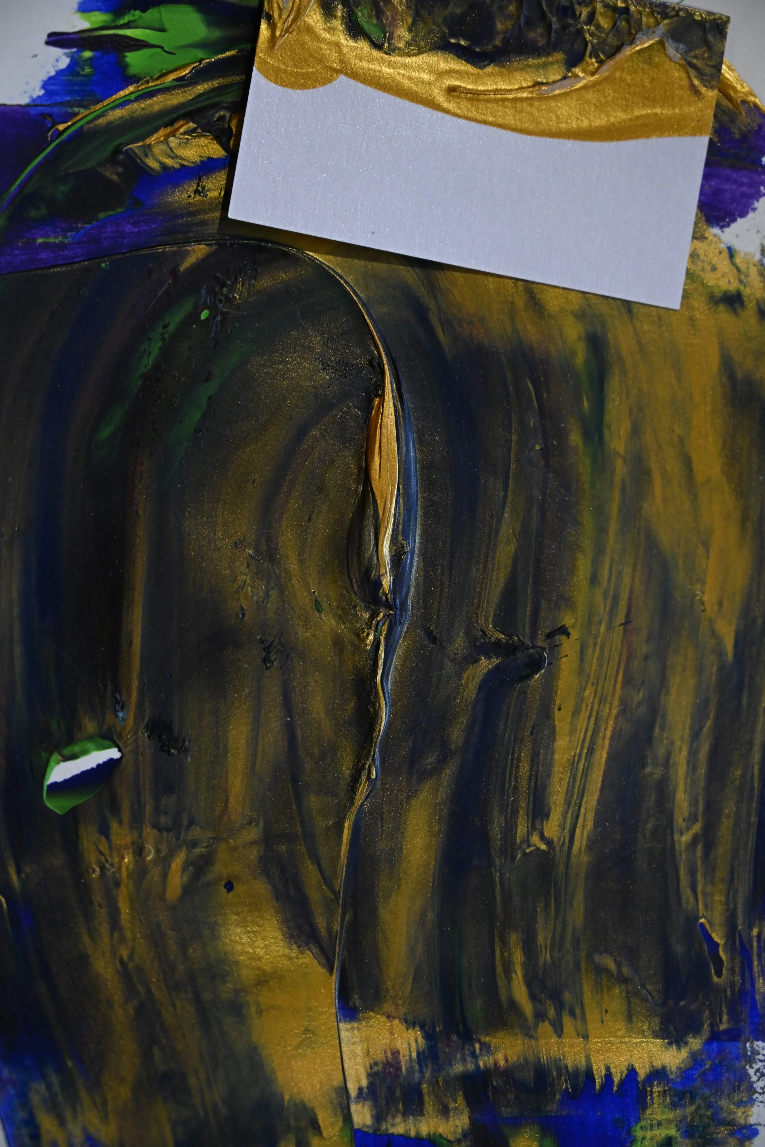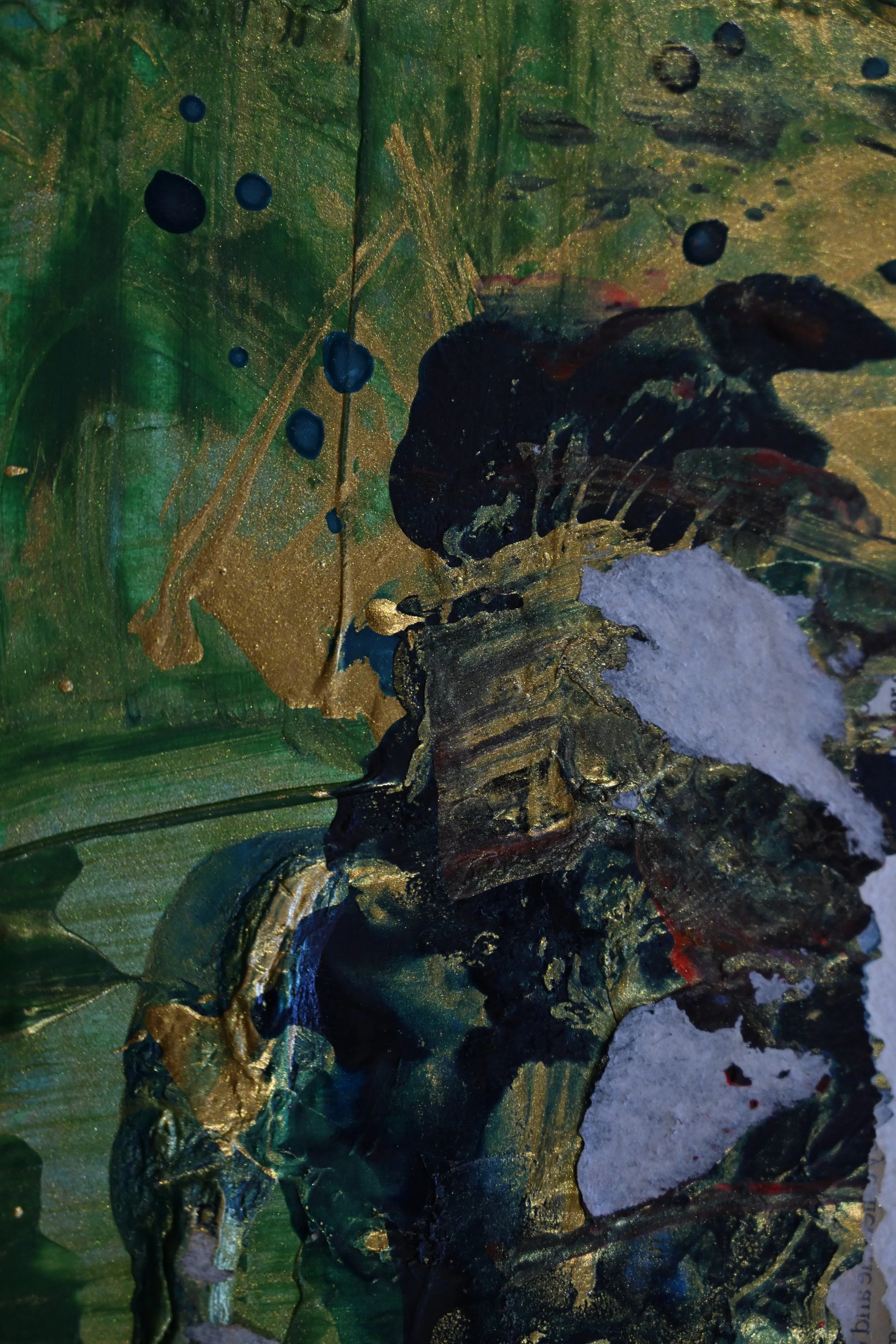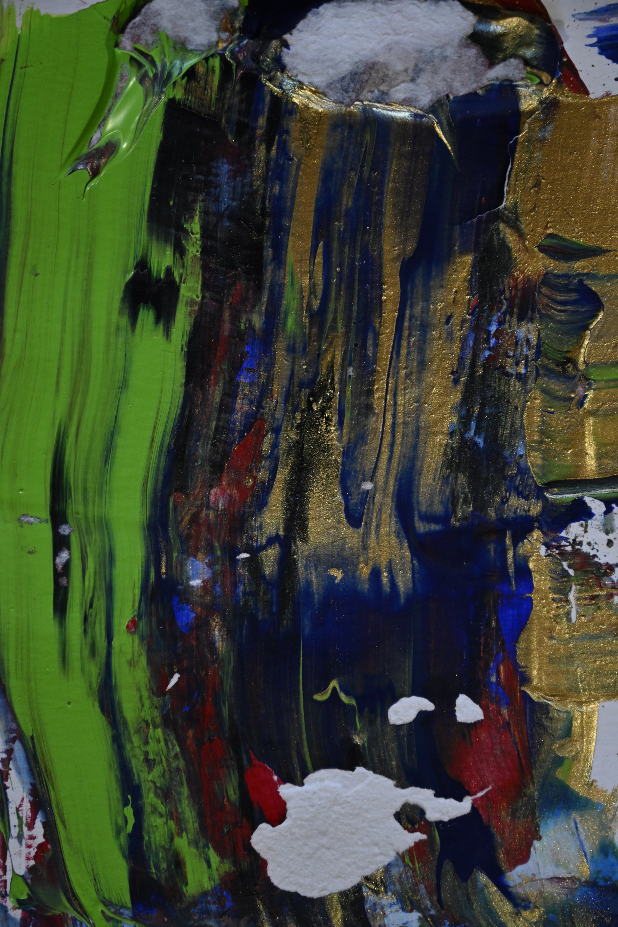 A blending of mark making, collage, cultural icons, abstraction.